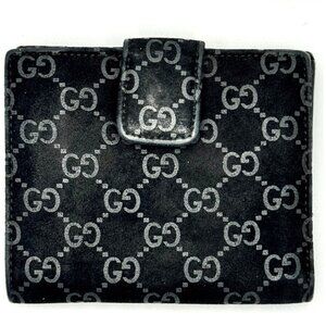 Gucci Black GG Monogram Suede Bifold Wallet with Snap Closure