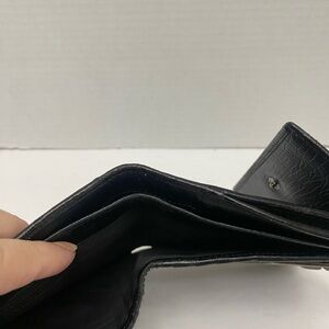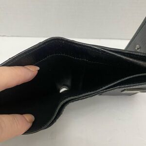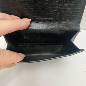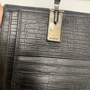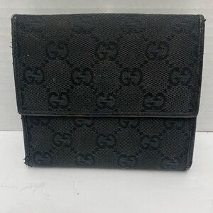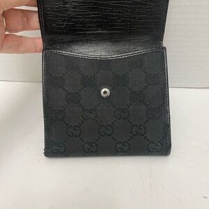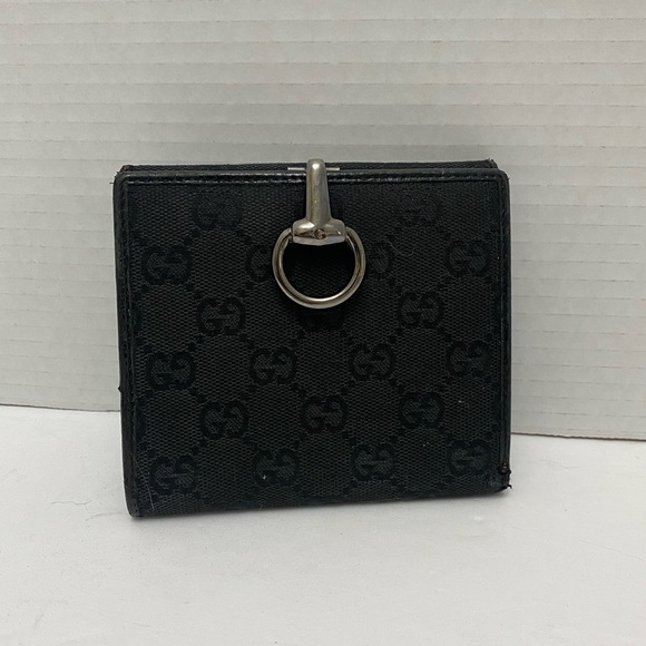Elegant black wallet canvas featuring Gucci's GG iconic monogram. Accented with a silver ring horse it clasp closure Beautiful condition. (367)