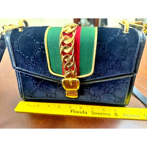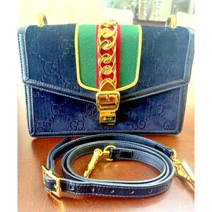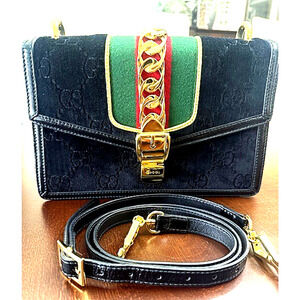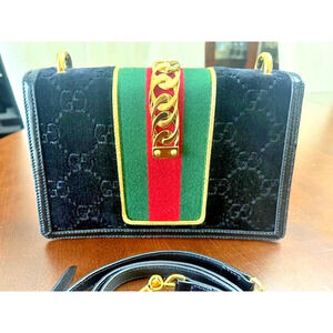 Gucci Black Gold GG Monogram Velvet Sylvie Small Shoulder Crossbody Bag GORGEOUS