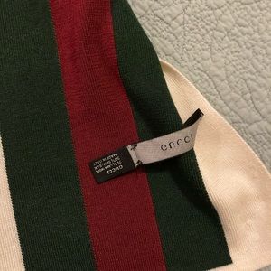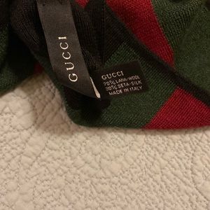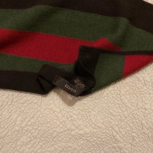 Stylish Gucci scarf with bold black, green, and red stripes. Perfect for adding a touch of luxury to any outfit.