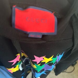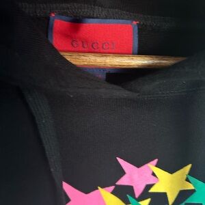 Gucci black hoodie adorned with colorful stars in pink, yellow, and green. Bold and trendy design. Like New