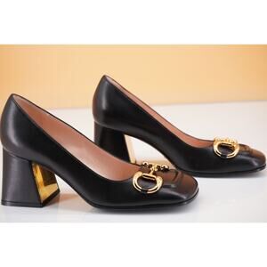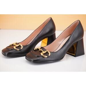 GUCCI BLACK LEATHER BABY BLOCK HEEL HORSEBIT PUMP SZ 35.5 NIB $920 SQUARE TOE