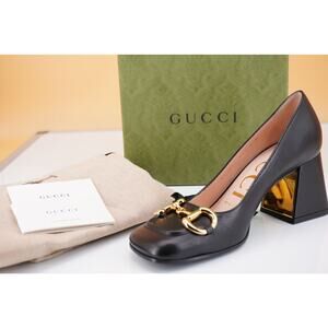 Gucci Black Leather Baby Block Heel Horsebit Pump SZ 35.5 NIB $920 Square Toe