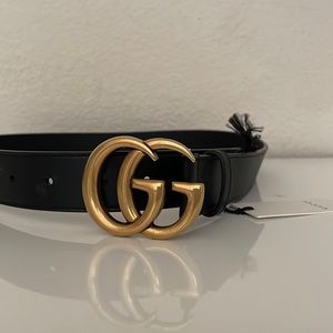 Stylish Gucci belt with black leather. Features a gold buckle. Light blue interior adds contrast. Ideal for versatile wear.