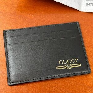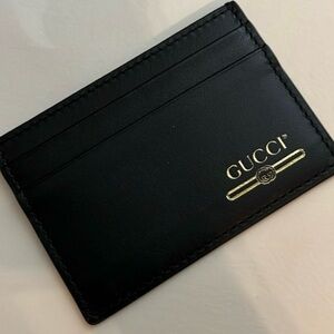 is crafted from smooth black leather, offering a minimalist design perfect for carrying essentials. Its slim profile ensures convenience without compromising on style, while the metallic Gucci logo adds a luxurious touch. So convenient to put your important cards and license and not have to carry anything else as your money fits too!