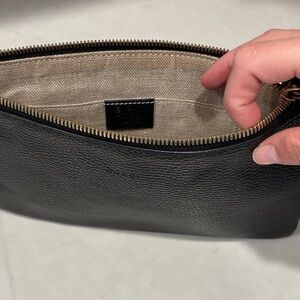 Elegant black leather clutch. Features bamboo tassels. Sleek and stylish design.