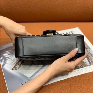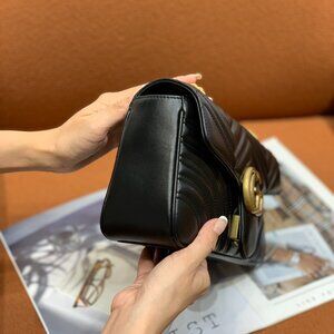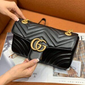 This luxurious Gucci shoulder bag showcases asophisticated black leather design with a distinctivechevron quilted pattern. The iconic double G logo inantique gold tone adds a touch of elegance,complemented by a versatile leather and chain strapfor both shoulder and crossbody wear.