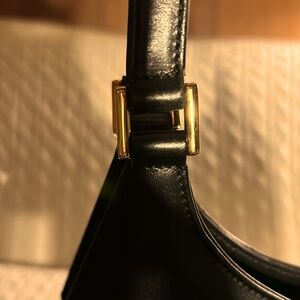 Elegant black leather tote bag with a minimalist design. Perfect for everyday use or a night out. Gold hardware. Slight rubbing on corners. Some peeling on the inside. Approximately 9.75”W x 8.75”H (in the middle) x 2.5”D. Strap drop 8.75.” Three compartments, middle has zip closure. One interior zip pocket. Thanks for looking! Open to reasonable offers!