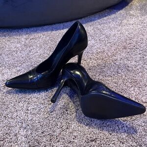 Chic black leather heels by Gucci. Sleek and stylish design. Perfect for any occasion.