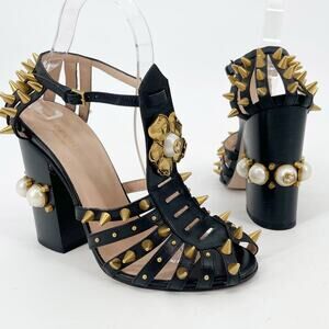 Gucci Black Leather Kendall Studded Pearl Embellished Cage Block Heels EU 39