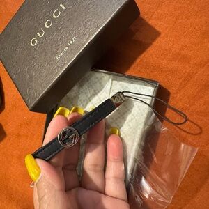Elevate your style with this Gucci black leather keychain. Perfect for adding a touch of luxury to your everyday essentials.