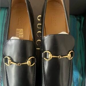 Elegant black leather loafers featuring gold hardware. Perfect for a sophisticated look.