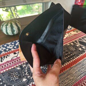 Hardware has some silvering. Light corner wear and light scratches as shown in photos. Pressure wear over snap on envelope flap. Inside is clean, no peeling. Snap Snaps and foldover Logo works smoothly with strong hold.