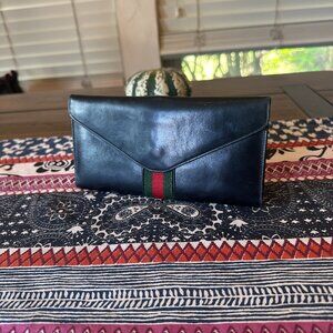 Gucci Black Leather Long Wallet Web Accent Foldover Clasp, Vintage and Rare
