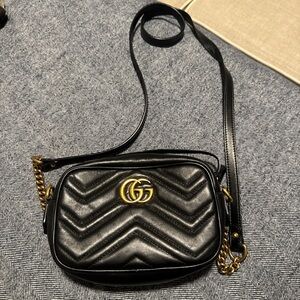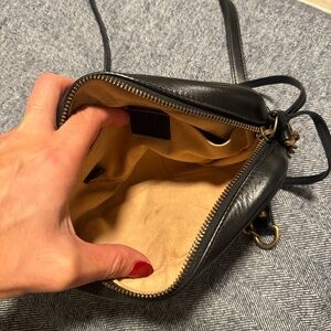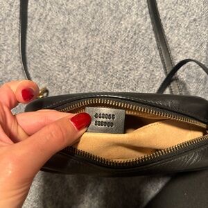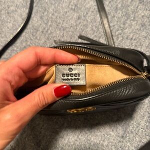 Elegant black leather pouch. Features gold zipper. Compact and stylish.