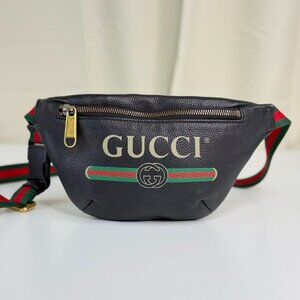 Gucci Black Leather Printed Bum Bag with Green & Red Stripes and Gold Hardware