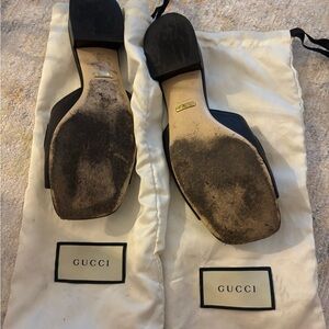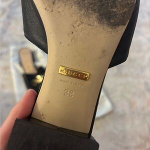 Chic Gucci sandals in black leather. Features elegant gold detail. Ideal for any occasion.