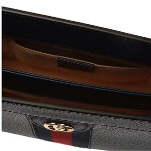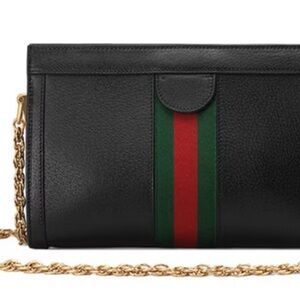 Elegant Gucci shoulder bag in black leather with signature green and red stripe. Perfect for any occasion.