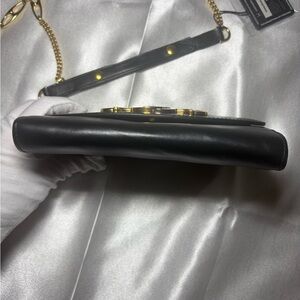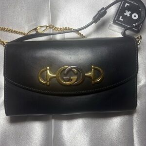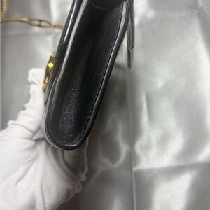 Elegant Gucci shoulder bag in classic black leather. Features a stylish gold chain strap for a touch of luxury. Perfect for any occasion.