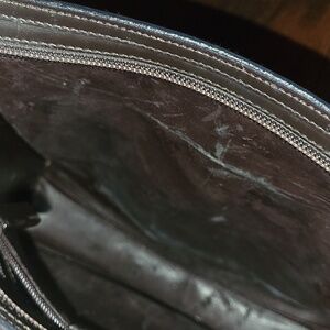 This sleek black leather Gucci Shoulder Bag with acrylic G and zipper pull Handles need re-gluing together.