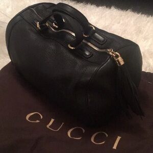 Luxurious black leather bag by Gucci. Sleek design with gold accents. Cute bag for shopping or on the go