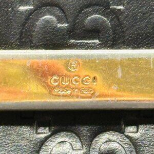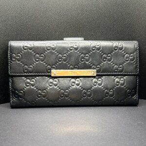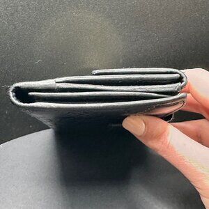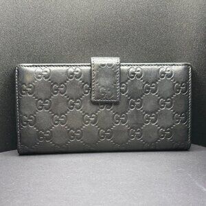 Elegant black leather wallet. Features embossed Gucci logo. Gold-tone hardware accent.