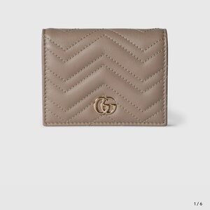 Chic Gucci wallet in embossed black leather. Features a stylish gold clasp.