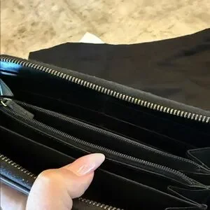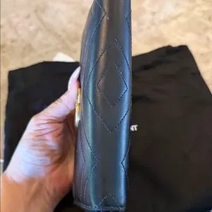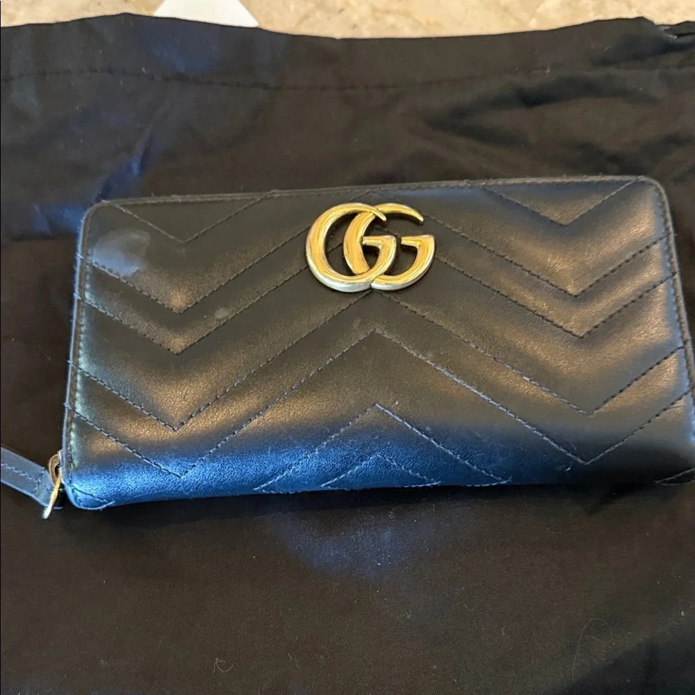 Sleek black leather wallet. Features iconic gold Gucci logo. Stylish and functional.