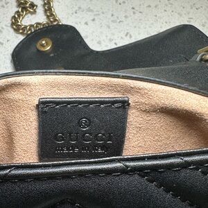 Chic black mini bag with signature gold GG logo. Stylish chain strap.