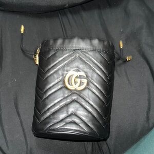This Gucci mini bag showcases a luxurious black leather design with a distinctive quilted pattern, complemented by elegant gold-tone hardware. Its compact size and sophisticated style make it a perfect accessory for any occasion.