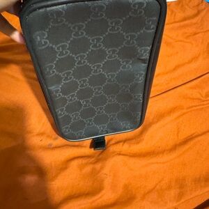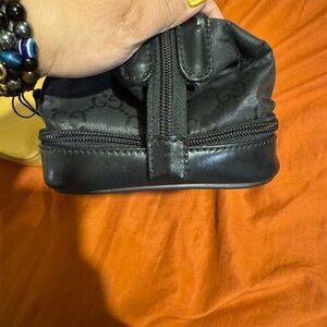 Stylish Gucci pouch with monogram design. Features a sleek black color.