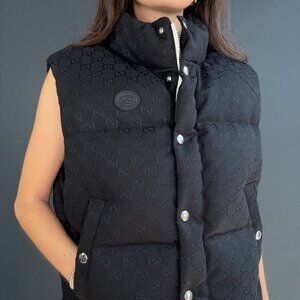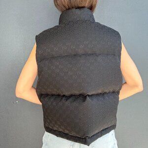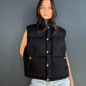 Gucci monogram puffer vest in black w/ silver buttons. Zipper and button closure. Two front pockets. Designer size XS