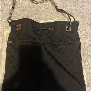 Chic Gucci tote in black. Features signature monogram pattern. Stylish chain strap detail. The hardware is perfect. No tarnish. The thin strap to close is open as you can see in the pictures but it doesn’t affect the purse. No peeling or holes anywhere. Corners are perfect. Very good conditions. 100%Authentic