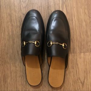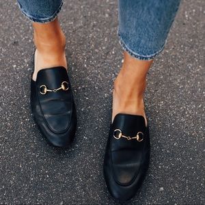 Elegant black mules. Gold hardware accent. Slip-on style. Perfect for any occasion.