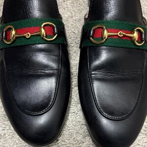 Stylish black mules by Gucci. Features green and red stripe detail. Ideal for a fashionable touch.