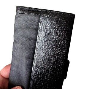 Gucci long wallet. Black Canvas with Black leather edging. Silver round wide "G" hardware on front leather flap.