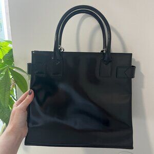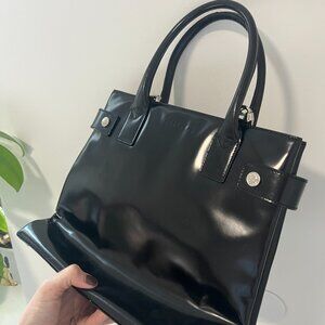 Gucci Black Patent Leather Handbag. Solid black. Slight scuff marks on front - not noticeable when wearing. Can be worn as a handbag or as a crossbody (strap is included). Structured bag. Multiple interior zip and open pockets.