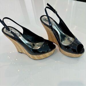 Gucci Patent Leather Platform Wedges in Black with buckled slingback, peep toe, and straw fabric heel. Worn and in good condition. Size 36.5. *See all photos for condition of scuffs/flaws, and wear on heels/soles.