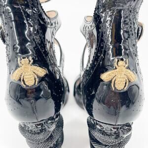 Gucci’s iconic Queercore pumps, crafted in glossy black patent leather with multi-strap buckle detailing. The vamp is adorned with the signature Dionysus crystal-embellished buckle, while the sculptural block heel features bold snake carving. Finished with metallic bee embroidery at the back, leather lining, and leather outsole. Made in Italy.