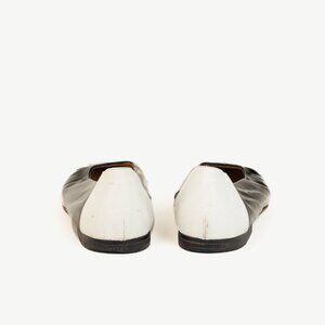 These flats from Gucci are crafted in a black patent leather trimmed in a contrast white, and feature low stacked heels, closed rounded square toes with GG logo applique, white counters, and leather lining and soles.