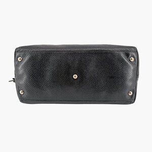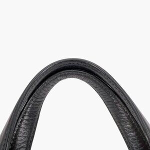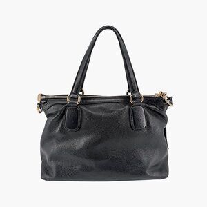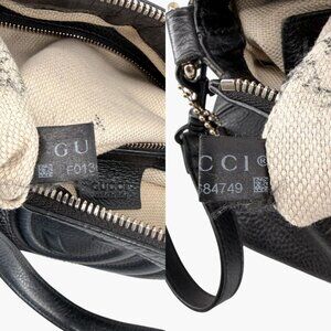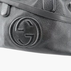 This Gucci Soho GG bag features black pebbled leather with oversized Interlocking G logo stitching, a leather tassel zipper pull, gold-tone hardware, and a canvas-lined interior. Designed with top handles and an adjustable shoulder/crossbody strap, it’s a versatile everyday carry suitable for work, travel, and polished casual styling.