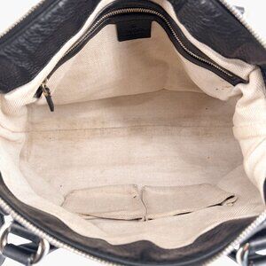 Bag shows signs of use, including light scuffing on leather, corner wear, and discoloration on canvas lining. Shoulder strap is not original to this bag (replaced with a generic leather strap).