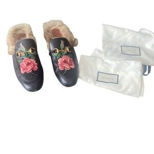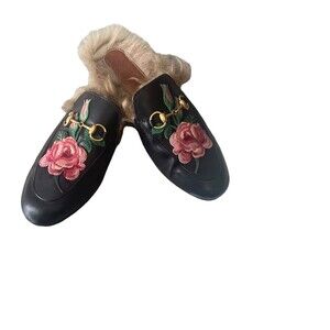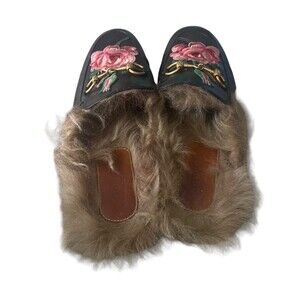 Gucci Black Floral Embroidered Leather Horsebit Princetown Fur Lines Mules Size 7