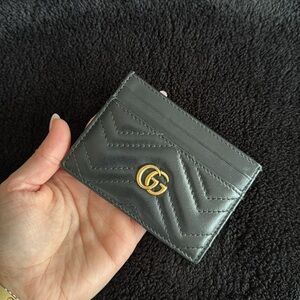 This elegant Gucci accessory is crafted from luxurious black leather, featuring the iconic GG logo in a gold tone. The quilted design adds a touch of sophistication, making it a perfect choice for organizing your essentials with style.