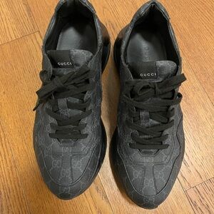 Gucci Rython size 12. Sleek black sneakers with iconic Gucci monogram. Perfect for casual wear. Comes with box, extra laces and dust bags.