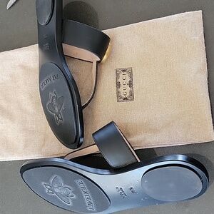 Stylish black sandals featuring the gold Gucci logo accent. Perfect for casual outings. EUC. The bottoms are slightly scuffed at the toes but not visible from the top. Euro size 35.5