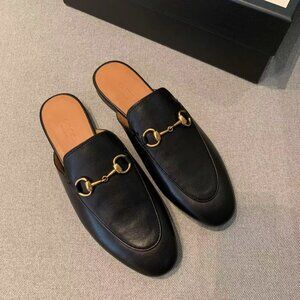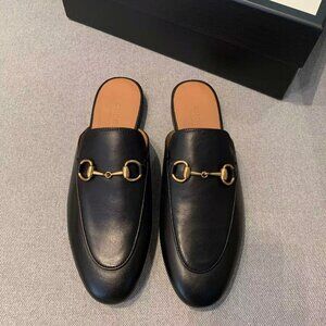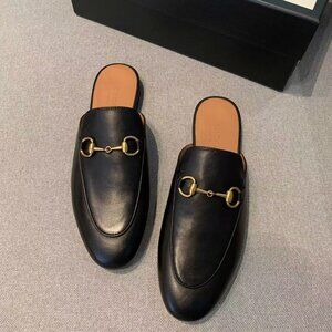 Stylish black sandals featuring a gold Gucci logo. Perfect for casual wear.
