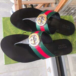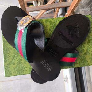 Elegant Gucci sandals featuring black base with iconic green and red straps. Stylish and comfortable for any occasion.
