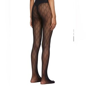 Elegant black sheer tights featuring the iconic Gucci logo pattern. Perfect for adding a touch of luxury to any outfit.