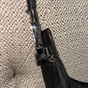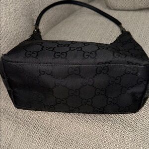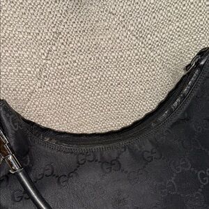 This Gucci shoulder bag in black features a unique crescent shape, offering a sleek and modern look. Crafted from a textured, water-resistant material, it combines style with practicality. The minimalist design and medium size make it an ideal choice for everyday use. Preloved see pictures. Zipper missing pull tag